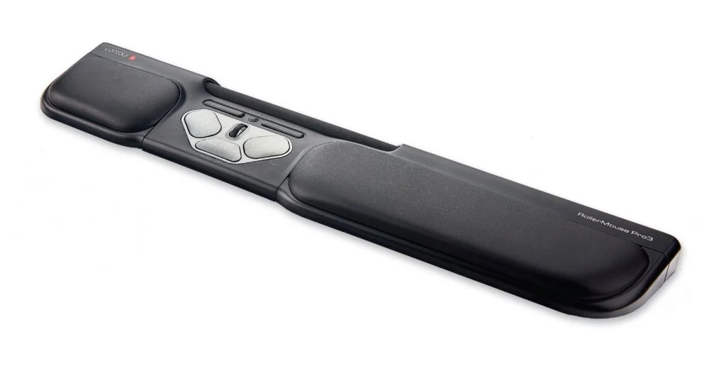 The RollerMouse Pro 3, by Contour Design, repositions the mouse tasks in front of and in alignment with the typing keys of the keyboard. The repositioning of the mouse buttons promotes neutral shoulder joint positioning, decreases extended arm reaching and promotes bilateral upper extremity involvement. Cursor movement is achieved via a roller bar positioned directly above/in front of the mouse buttons. To be used with most standard size, straight keyboard products that do not have an attached/built in front palm rest or lip/edging.